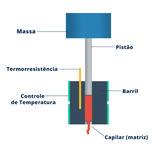 Este aparelho permite determinar o índice de fluidez de materiais termoplásticos no estado de fusão sob condições de pressão e temperatura controlados. Após o pré-aquecimento, o termoplástico é carregado por um pistão e extrudado através de uma matriz.